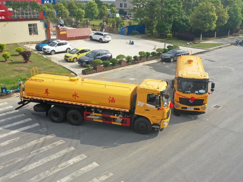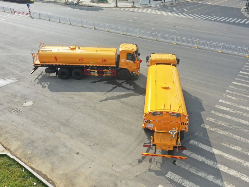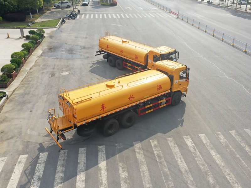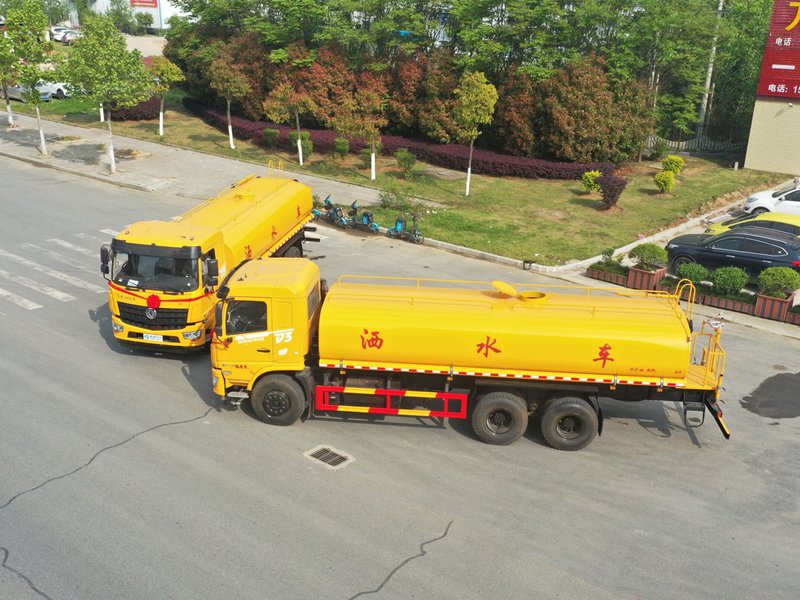 11.00R20鋼絲胎,空調、中控鎖、電動玻璃、氣囊座椅、多功能方向盤、 轉向器及離合器液壓助力,氣壓制動,排氣制動。用功能配置:罐體實際容積約為19立方米,(罐體有效參數15.17立方米、額定載質量14520kg、)采用武鋼優質碳鋼板卷壓成型。配備專用灑水泵,自吸自排,前噴后灑、側噴、后工作平臺及灑水高壓炮。灑水泵自吸高度為6米左右,整車灑水寬度14米左右,后工作平臺水炮可調成:直沖狀、大雨、中雨、小雨、毛毛雨,有效射程≥28米,整車帶接頭、水位計,自流閥。后工作平臺主管路帶1寸澆花接口,附送2根3米水管,1個爬梯,兩側及后保險杠。 19噸東風D3后雙橋灑水車選裝配置: