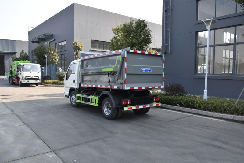 改裝容積3~4立方米,箱體采用Q235碳鋼,板材邊三底四,國內知名油缸、多路閥,掛桶提升機構,外部操作,后蓋手動開啟。