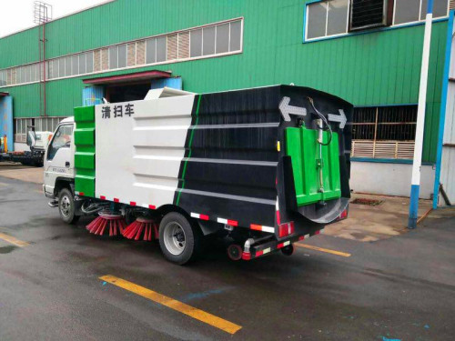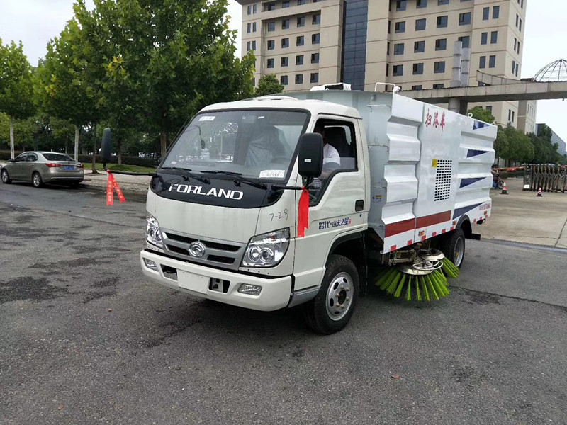 該掃路車采用福田型二類底盤改裝,加裝副發動機、風機、清水箱、垃圾箱、左右立掃、后置盤,掃盤降塵系統,液壓系統、專用裝置電控系統和副車架等改裝而成。