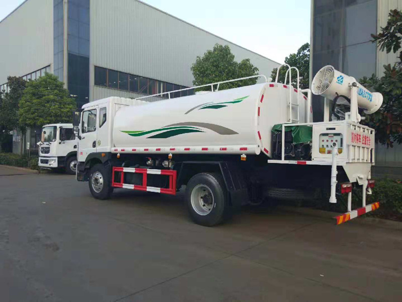 東風多利卡D9噴霧抑塵灑水車_抑塵車多少錢一輛;我公司生產的東風多利卡D9噴霧抑塵灑水車下線檢測了。車款車型選用東風多利卡D9系列單橋底盤,3950mm軸距,新款排半駕駛室,康明斯ISB180 50六缸發動機,國五排放,250mm車架,氣制動,動力轉向,離合助力,空調,電動窗,中控鎖,ABS,8噸后橋,4噸前橋,東風六檔變速箱,9.00R20鋼絲胎。選配30米噴霧抑塵機。罐體用5MM碳鋼板制作,罐內隔板具有防波作用,以減低汽車行駛時罐體液體的沖擊。整車帶一個專用灑水泵(垂直吸程6米),灑水寬度14米,射程28米。多功能灑水車配備2個前沖(噴)(能將路面泥巴、塵土、垃圾沖干凈);2個后灑(能均勻地將水灑在路面,一次灑水寬度14米)、2個側噴(花灑)(能均勻地將路旁綠化帶澆灌)、帶1個后工作平臺,平臺上安裝1個綠化灑水高炮(灑水炮可全方位旋轉,可連續調成直沖狀、大雨、小雨、毛毛雨,霧狀可調節沖洗高大樹木),引水時間<5min,流量90m3/h。帶1個消防接頭,帶1個自流閥,1個過濾裝置、人性化爬梯及側防護欄,安裝灑水音樂喇叭。