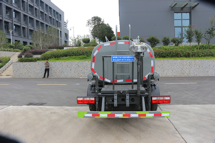 專用部分配置:罐體容積為4.5m3,采用4mm 碳鋼板制作,灑水車帶前沖、后灑、側噴、后工作平臺,平臺上安裝綠化灑水高壓炮,炮可360°旋轉,可調節噴射形狀(直沖狀、大雨、小雨、中雨、毛毛雨),帶自吸泵,可達到自吸自排功能,整車帶消防接頭、自流閥,1個爬梯,兩側及后保險杠,另附送2根3米管。