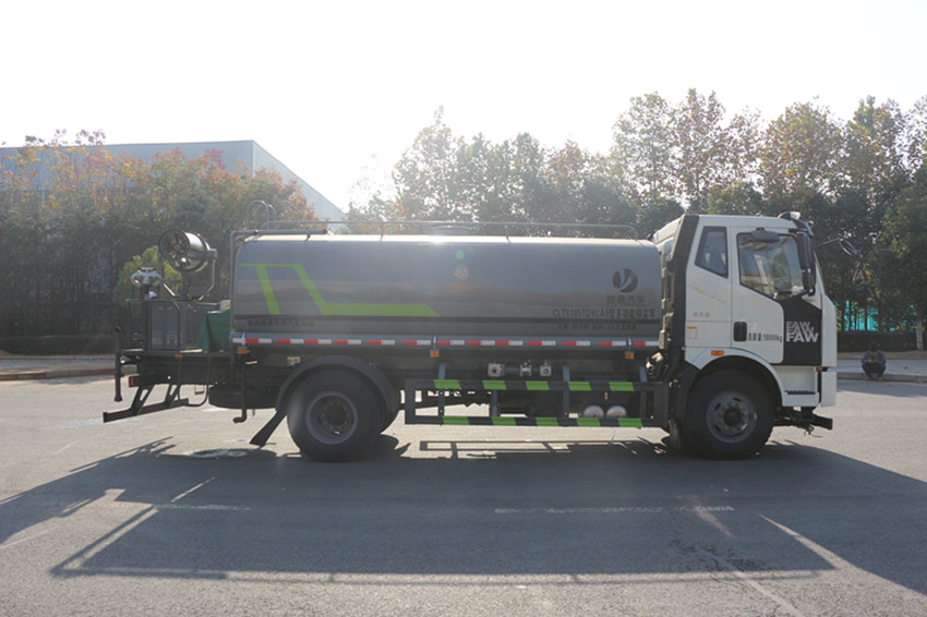 選裝噴霧裝置樣式。該車用途為抑塵降霾,主要裝置為罐體及噴霧裝置;罐體有效容積:12.5立方米, 罐體外形尺寸(長×長軸×短軸)(mm):4800×2400×1530;ABS系統生產廠家:長春瑞立科密汽車 電子有限公司,型號:CM4XL;側、后防護材料均為:Q235碳鋼,連接方式均為:螺栓連接,后部防護 截面尺寸(mm):120×50,后部防護離地高度(mm):480。隨底盤選裝駕駛室。 |