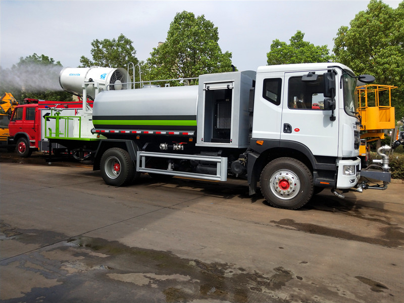 前噴后灑,前裝有鴨形噴嘴或圓頭沖嘴,后面裝有圓柱開灑水噴嘴或蓮蓬頭噴嘴,后部有一工作平臺,裝配有高壓水炮。后部還可裝8個噴嘴(選裝)噴水器一般用于沖洗街道。