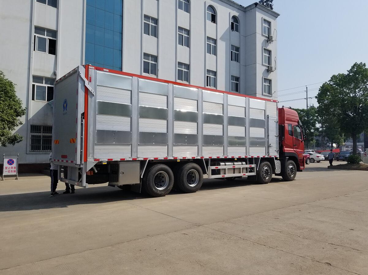 東風天龍前四后八全鋁合金運輸車,又稱鋁合金禽畜運輸車,可做三層或四層,品質更佳,車身結構采用鋁合金打造,不銹鋼噴頭和飲水頭,相比鋼制車體,重量減輕20%-30%,可以裝載更多的畜禽,空車行駛節約燃料,低維保費用,不生銹,生命周期無線延長,無需漆面保護,清潔簡單便捷,操作簡易,車廂升降平臺由全液壓控制,遙控操作更加簡便,自動恒溫系統,車廂設計合理方便控制家禽上下車,遙控升降車,動物福利,更大的 內部空間,家禽在車廂內更感舒適,溫度控制系統,沖淋飲水系統,遙控側面通風系統,可開合側窗系統,強制通風系統。
