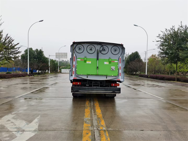 6)具備倒車保護(hù)裝置,在作業(yè)過程中如遇緊急倒車,智能化的控制系統(tǒng)會(huì)自動(dòng)停止作業(yè)并收回掃盤、吸盤和側(cè)噴桿;具有防止舉升垃圾箱翻車保護(hù);具有檢修安全保護(hù)。