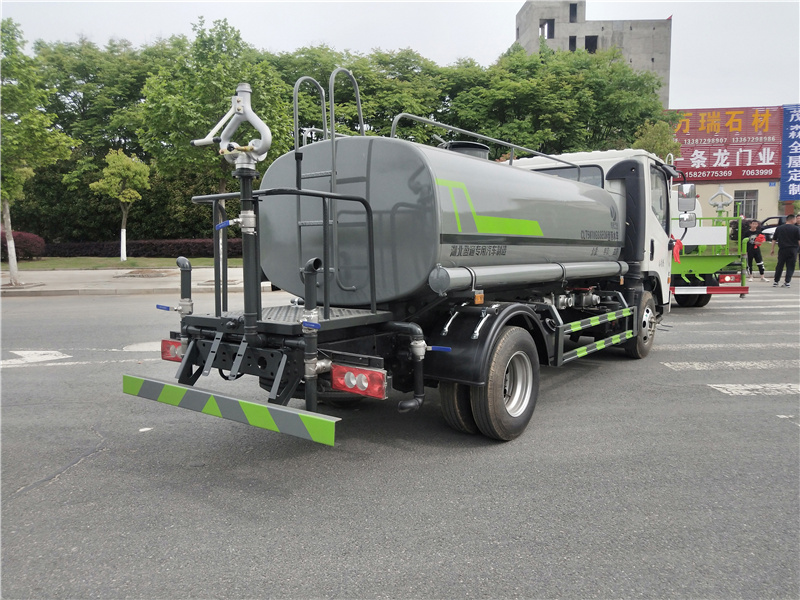 小型灑水車具有前沖后灑、灑水車側噴(更換噴頭后變為側花灑)、后置式工作平臺(帶踏梯,四周有安全護欄)、平臺上設置有高壓水炮(可360°旋轉,可調成柱狀最大射程28米,也可調成霧狀最大射程14米,可調成:直沖狀、大雨、中雨、小雨、毛毛雨。整車灑水寬度大于14米,配備優質大功率專用灑水泵,取力器,雜物過濾網,國標通用65型消防接口(可通過消防栓加水)、1套自流球閥系統(可自吸自排,最大吸程6米),2根引水鋼絲膠管(帶陰陽快速接頭),配鎖、水位計、作業高音喇叭、兩側及后加強型保險杠、防滑爬梯、膠管儲存筒。