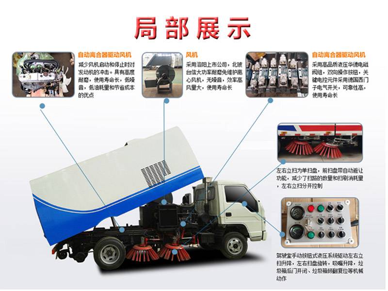 4、東風(fēng)2噸小型掃路車(chē)采用中置4盤(pán)刷+后置吸盤(pán)的清掃結(jié)構(gòu),三段式工作,清掃效果更好。