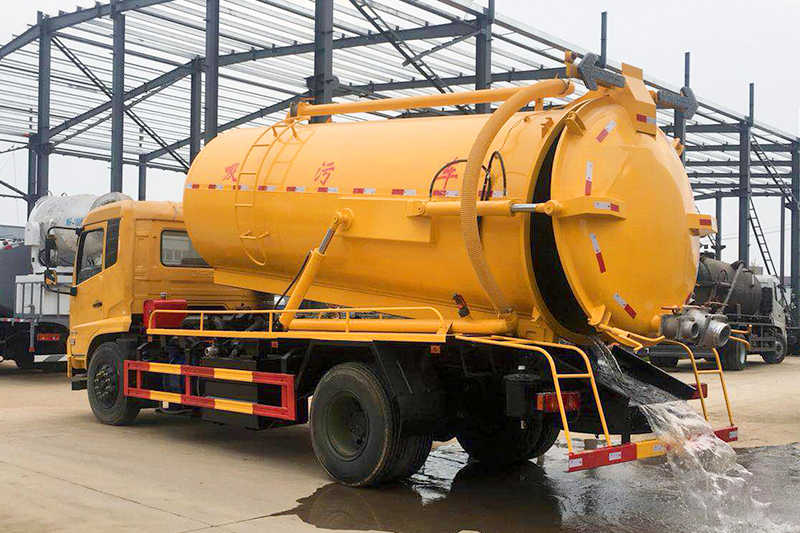 2、罐體液壓升舉,后蓋液壓打開。便于將各種淤泥污水傾倒干凈,方便清理罐體。