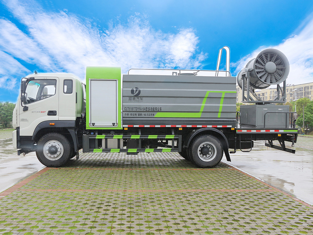 三.產品主要技術參數 序號 名稱 型號、規格 1 整車型號 CLT5187TDYBJ6A 型多功能抑塵車 2 發動機型號 YCS06245-60 3 發動機馬力/功率 玉柴 245 馬力/180KW 4 發動機排量 6234ML 5 變速箱 法士特 8 檔(帶高低檔) 6 輪胎規格 10.00 鋼絲胎 7 軸距 4500 8 總質量 18000KG 9 整備質量 9800KG 10 額定載質量 8005KG 11 整車尺寸(長×寬×高) 8.67*2.5*3.8 12 罐體容積 12 方 13 燃料種類 柴油 14 排放標準 國六 15 水泵型號 60/90 16 罐體材質 Q235 碳鋼